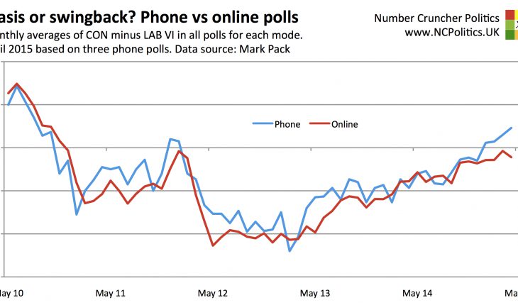 Having seen the interesting piece by Adam Ludlow at ComRes, which highlighted the differences between recent phone and online polls, I thought I’d put together a chart comparing the spread between the two main parties’s support as measured by each mode over the entire parliamentary term. My source, as usual, is Mark Pack’s opinion poll database.